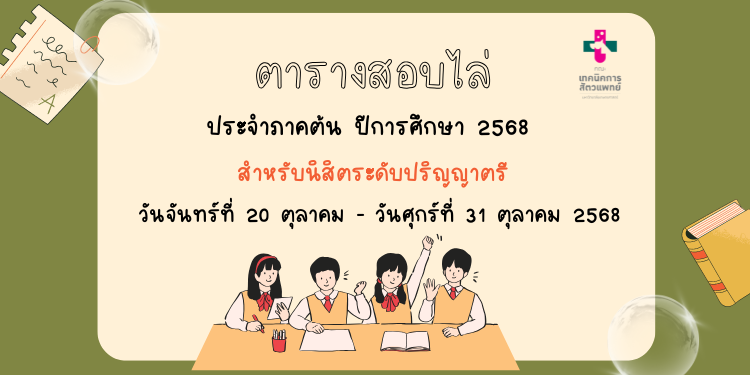 ปฏิทินกิจกรรม(ฉบับแก้ไข) กำหนดการวันฝึกซ้อมย่อย วันซ้อมใหญ่ และวันพิธีพระราชทานปริญญาบัตร ประจำปีการศึกษา 2567 คณะเทคนิคการสัตวแพทย์ มหาวิทยาลัยเกษตรศาสตร์ (ฉบับแก้ไข)่ 11 ก.ย. 2568่ 6 ต.ค. 2025อ่านต่อ